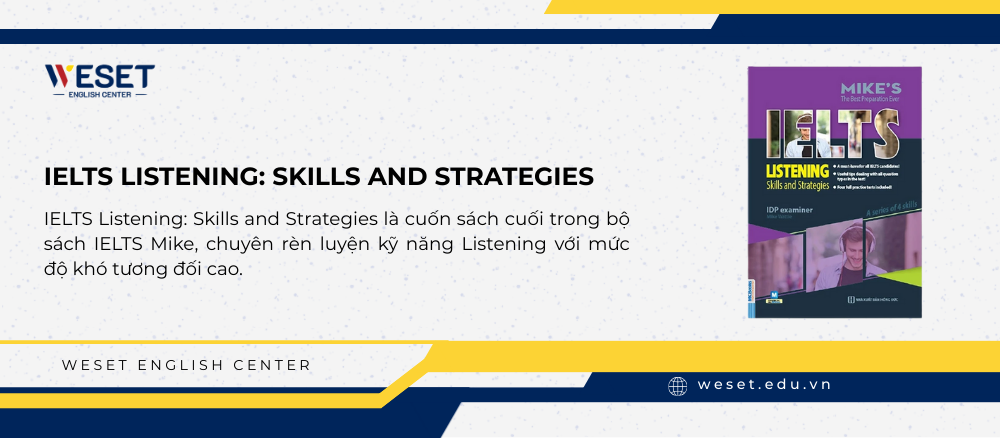 IELTS Listening: Skills and Strategies là cuốn sách cuối trong bộ sách IELTS Mike, chuyên rèn luyện kỹ năng Listening với mức độ khó tương đối cao. Sách thường được dùng để nâng nền kỹ năng và làm quen với áp lực bài thi thật.