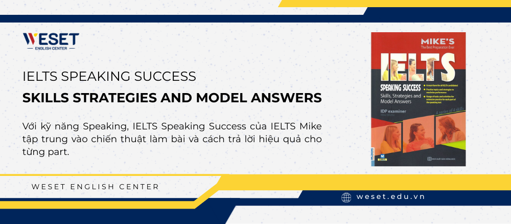 Với kỹ năng Speaking, IELTS Speaking Success của IELTS Mike tập trung vào chiến thuật làm bài và cách trả lời hiệu quả cho từng part. Sách cung cấp hệ thống câu trả lời mẫu theo các chủ đề quen thuộc, giúp người học hình dung rõ cách triển khai ý mạch lạc và tự nhiên.