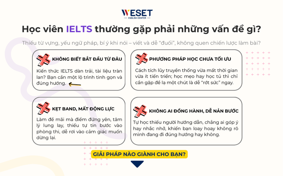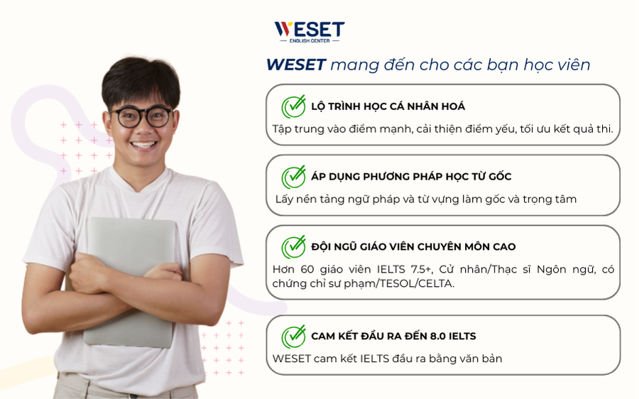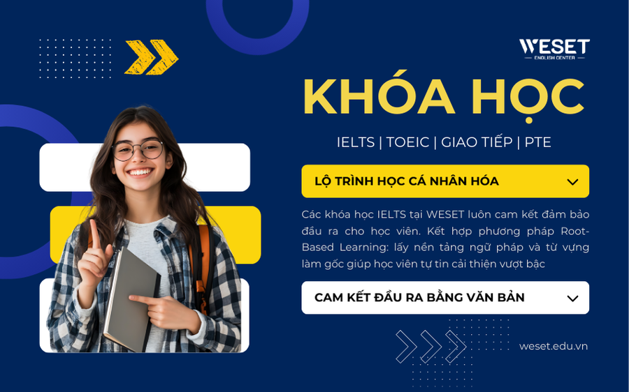 WESET English Center – trung tâm luyện thi tiếng Anh cam kết đầu ra tại TP HCM. Với nhiều năm kinh nghiệm trong lĩnh vực đào tạo tiếng Anh và luyện thi IELTS, WESET tự hào là trung tâm luyện thi IELTS, luyện thi TOEIC chuyên sâu uy tín giúp hàng ngàn học viên đạt được ước mơ du học, định cư và phát triển sự nghiệp