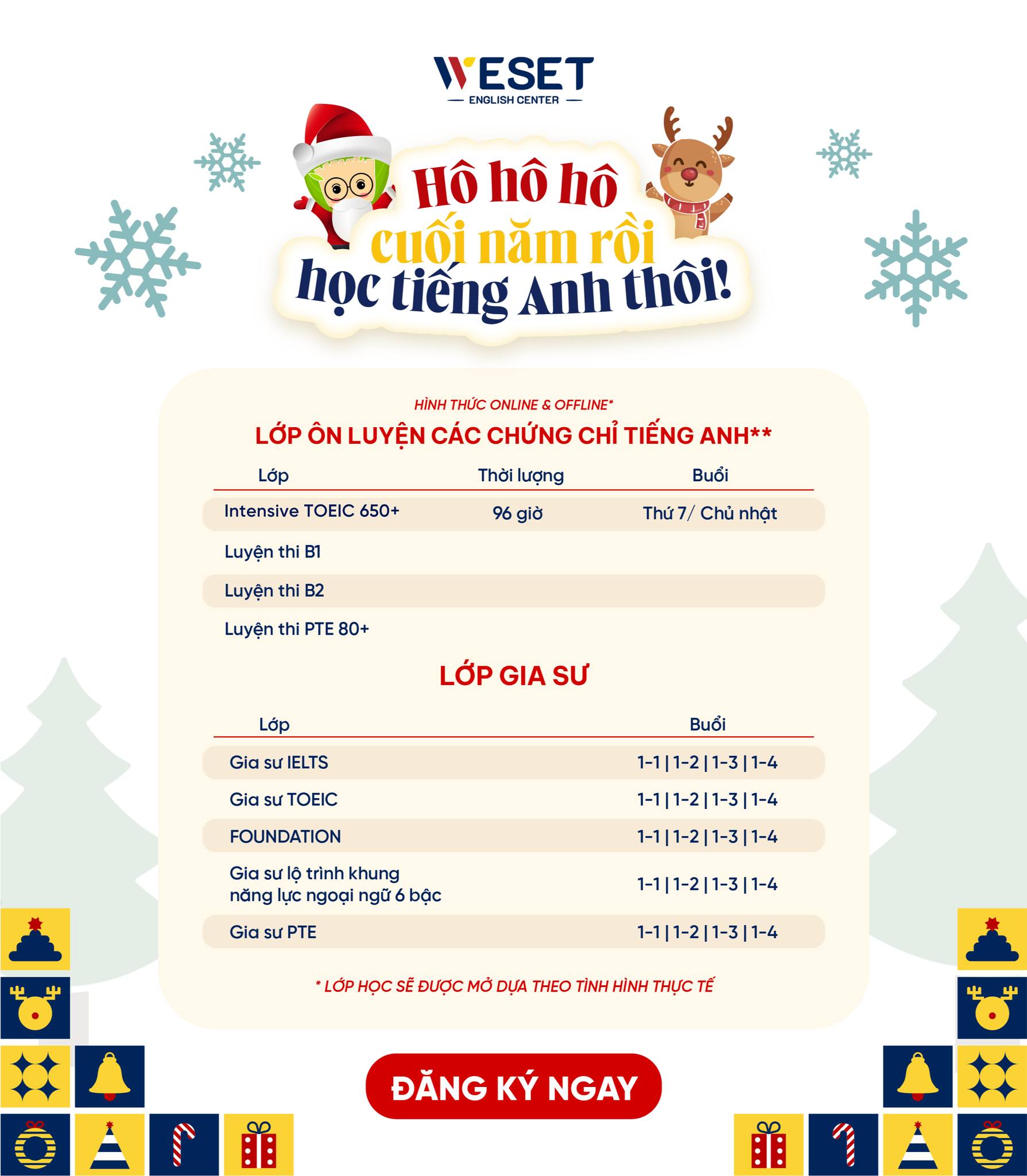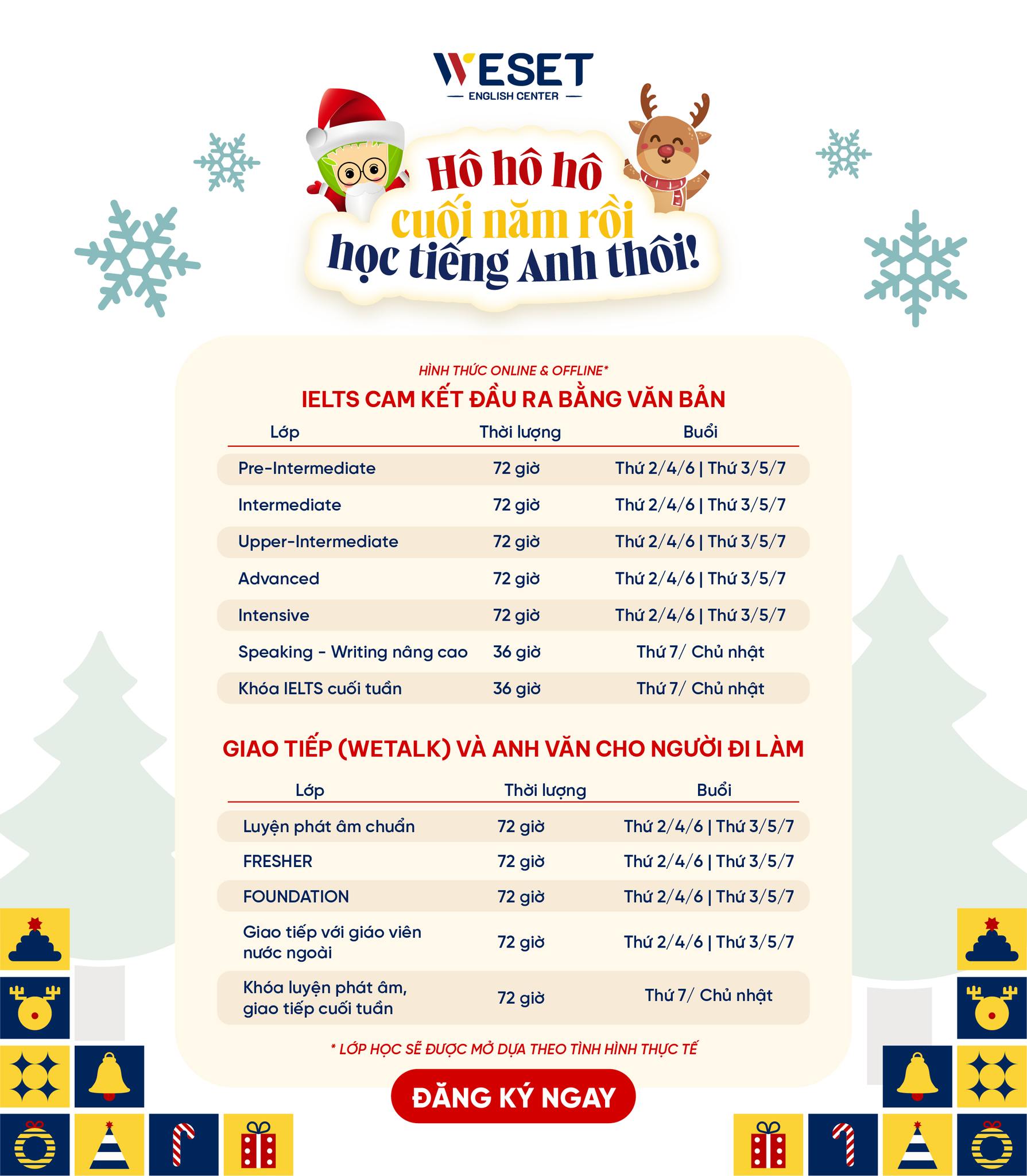 🌟 WESET sẽ dành tặng bạn điều gì? Không phải là hộp quà rực rỡ dưới cây thông, mà là lịch khai giảng tháng 12 đầy hứng khởi. Với đội ngũ giáo viên IELTS 7.5+, sở hữu TESOL/CELTA, WESET mang đến môi trường học chuẩn quốc tế, đầy chuyên nghiệp và truyền cảm hứng.