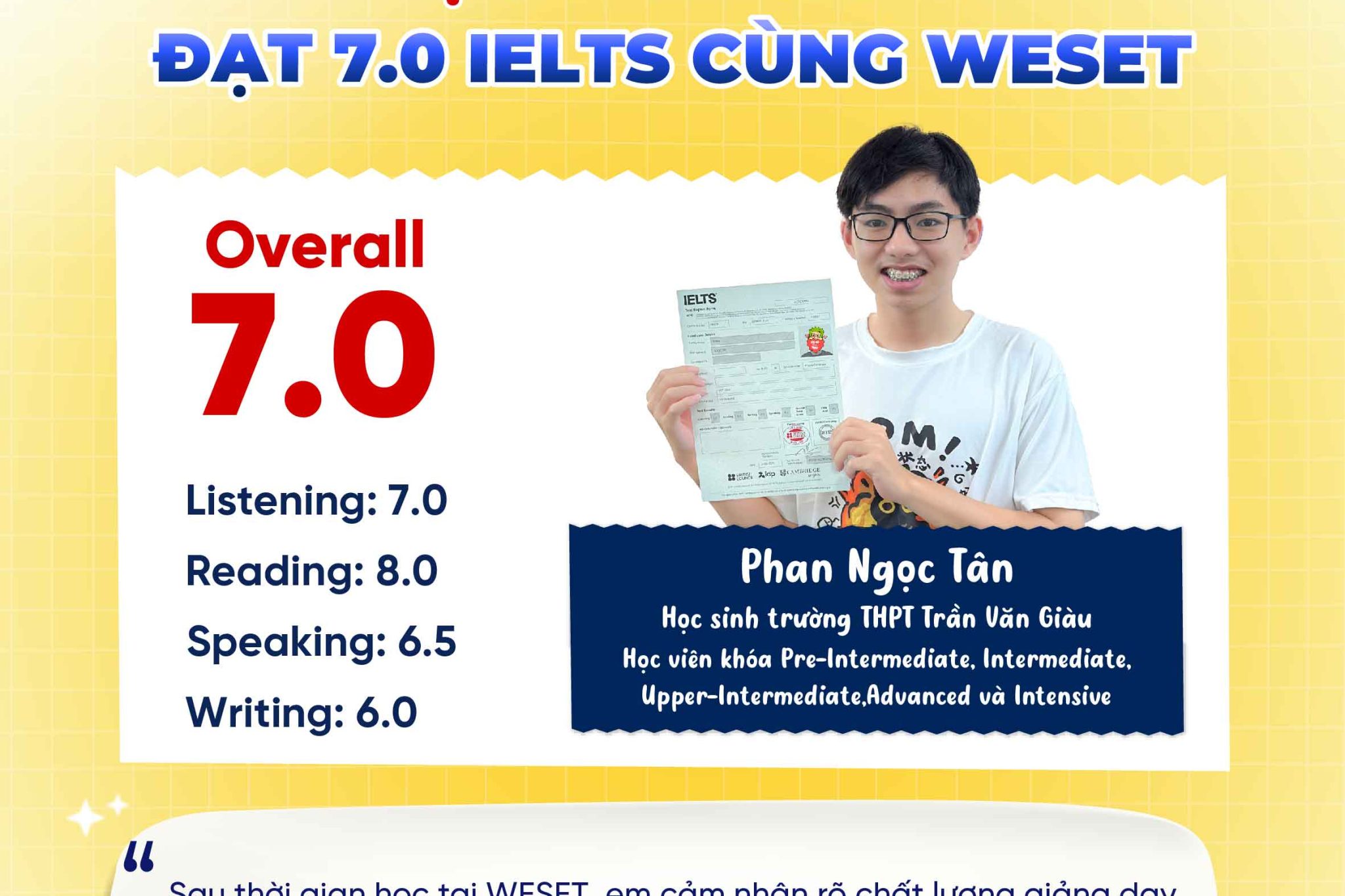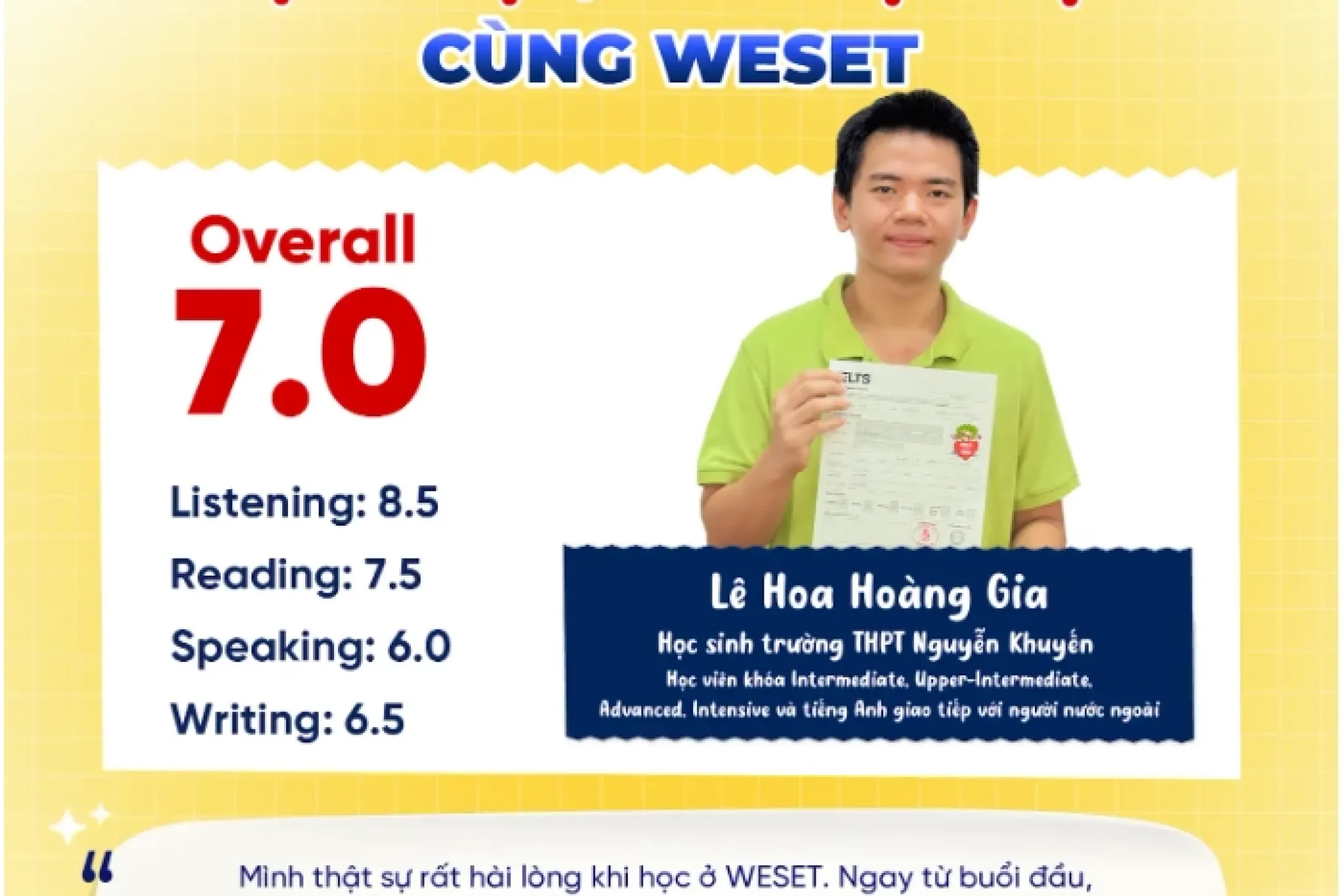 Tại WESET English Center, mỗi học viên đều được xây dựng lộ trình cá nhân hóa nhằm đạt được mục tiêu cho các bạn học viên. WESET tổng hợp những kết quả nổi bật mà học viên đã chinh phục trong suốt quá trình học tập tại trung tâm. Mỗi câu chuyện đều đi kèm điểm số được kiểm chứng, phản ánh sự nỗ lực của học viên và sự đồng hành sát sao từ đội ngũ giáo viên chuyên môn cao.