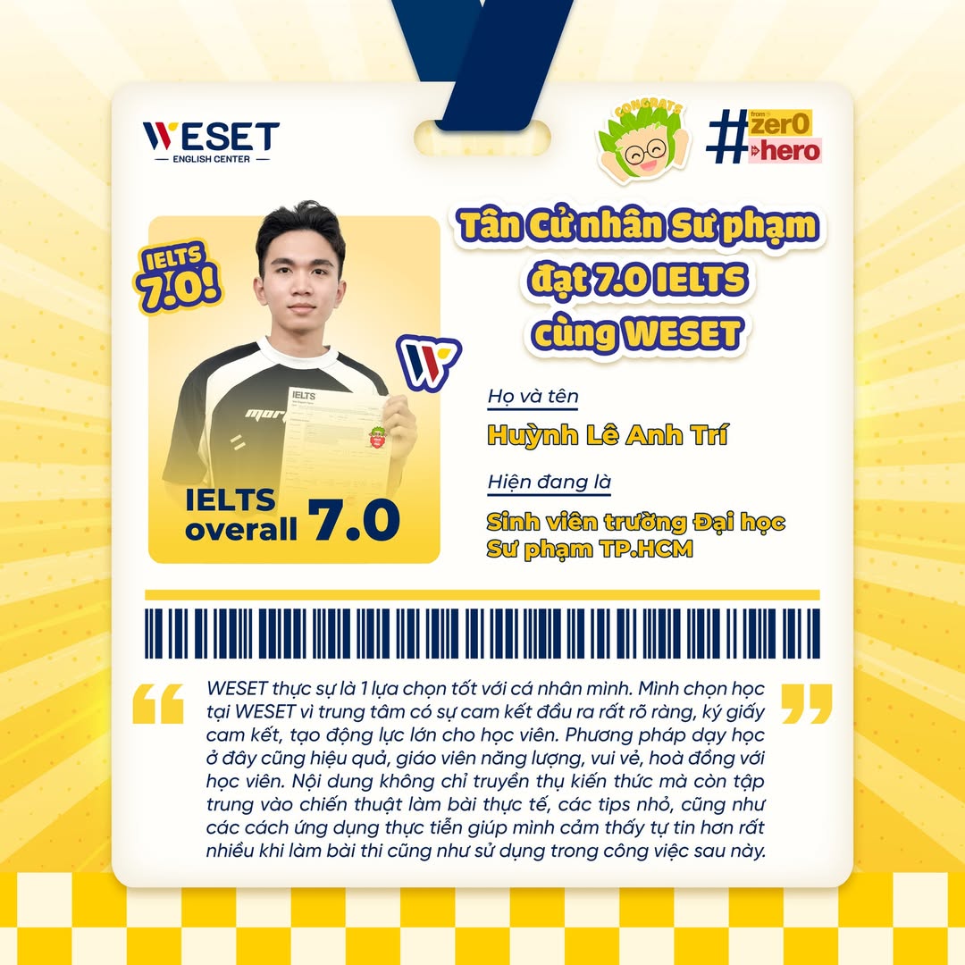 Huỳnh Lê Anh Trí – Tân cử nhân Trường Đại học Sư phạm TP.HCM đã chính thức cán mốc 7.0 IELTS Overall cùng WESET
