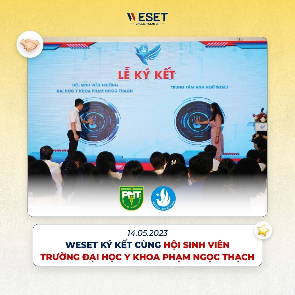 🥼 Trong khuôn khổ Đại hội Hội Sinh viên trường Đại học Y khoa Phạm Ngọc Thạch, WESET chính thức tái ký kết hợp tác chiến lược với Hội Sinh viên Nhà trường. Việc tái ký kết đánh dấu bước tiến mới trong quá trình đồng hành dài hạn, mở rộng các chương trình hỗ trợ năng lực ngoại ngữ dành cho sinh viên Y cũng như đội ngũ y học tương lai của đất nước.