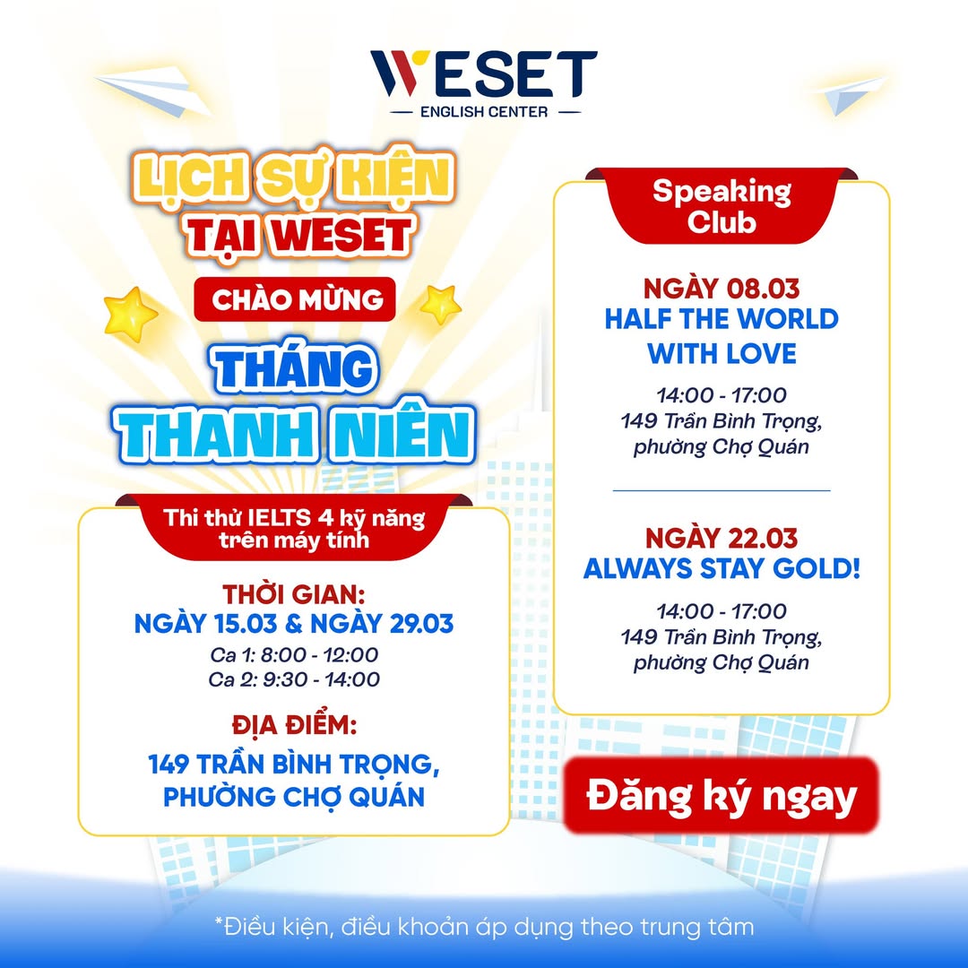 - Giảm lệ phí thi IELTS còn 3.999.999 đồng khi đăng ký qua WESET*.