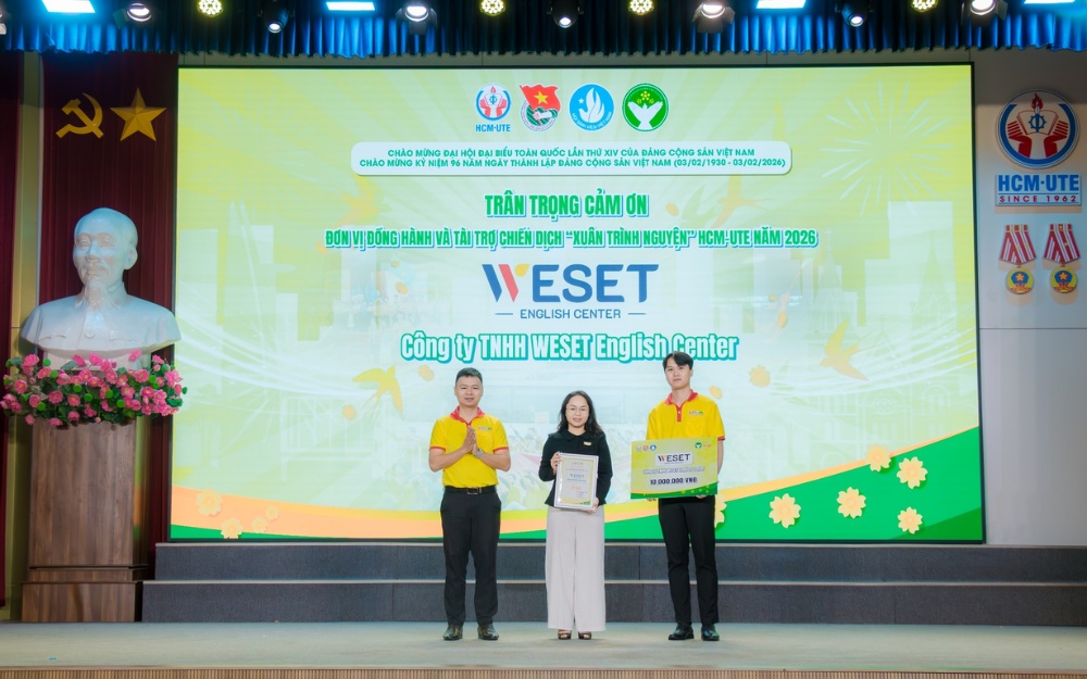 Đồng hành cùng chương trình, WESET ENGLISH CENTER vinh dự là đơn vị tài trợ và đối tác đồng hành, góp phần tiếp sức cho Chiến dịch Xuân Tình Nguyện HCM-UTE 2026. Trong khuôn khổ buổi lễ, WESET đã trao tặng các suất học bổng ý nghĩa dành cho sinh viên vượt khó, như một lời động viên thiết thực để các bạn thêm vững tin trên con đường học tập, phát triển bản thân và chinh phục tương lai.