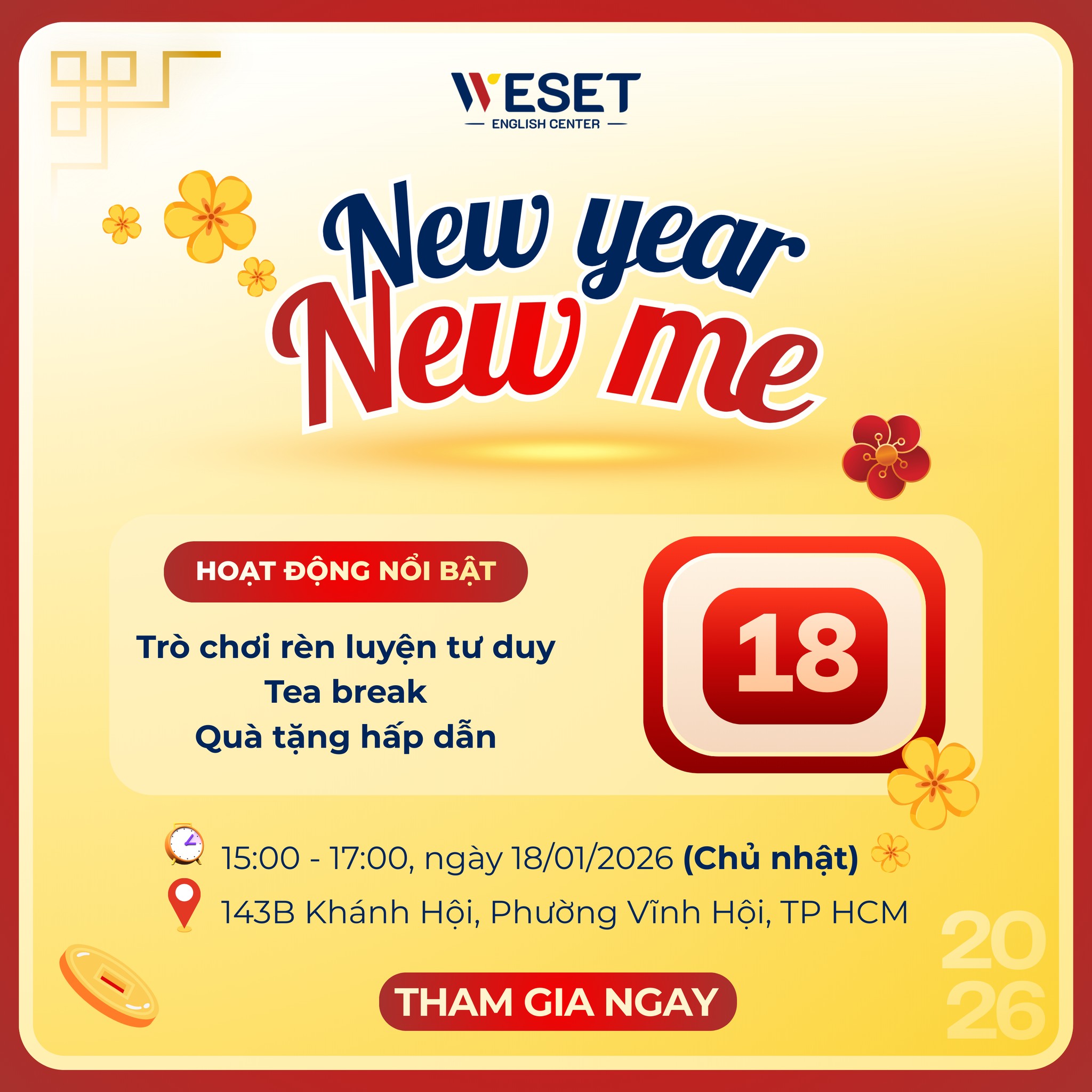 Trong bầu không khí rộn ràng của những ngày giáp Tết, khi mọi người cùng chuẩn bị đón chào một năm mới đầy hy vọng, WESET trân trọng mời bạn tham gia buổi Speaking Club đặc biệt mang tên “New Year, New Me”.
