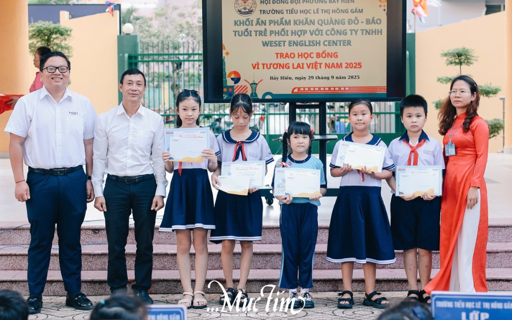 Sáng 29-9, chương trình Học bổng Vì tương lai Việt Nam phối hợp giữa Khối ấn phẩm Khăn Quàng Đỏ (Báo Tuổi Trẻ) và WESET English Center đã trao tặng các suất học bổng, động viên học sinh có hoàn cảnh khó khăn tại Trường tiểu học Lê Thị Hồng Gấm (TP.HCM).