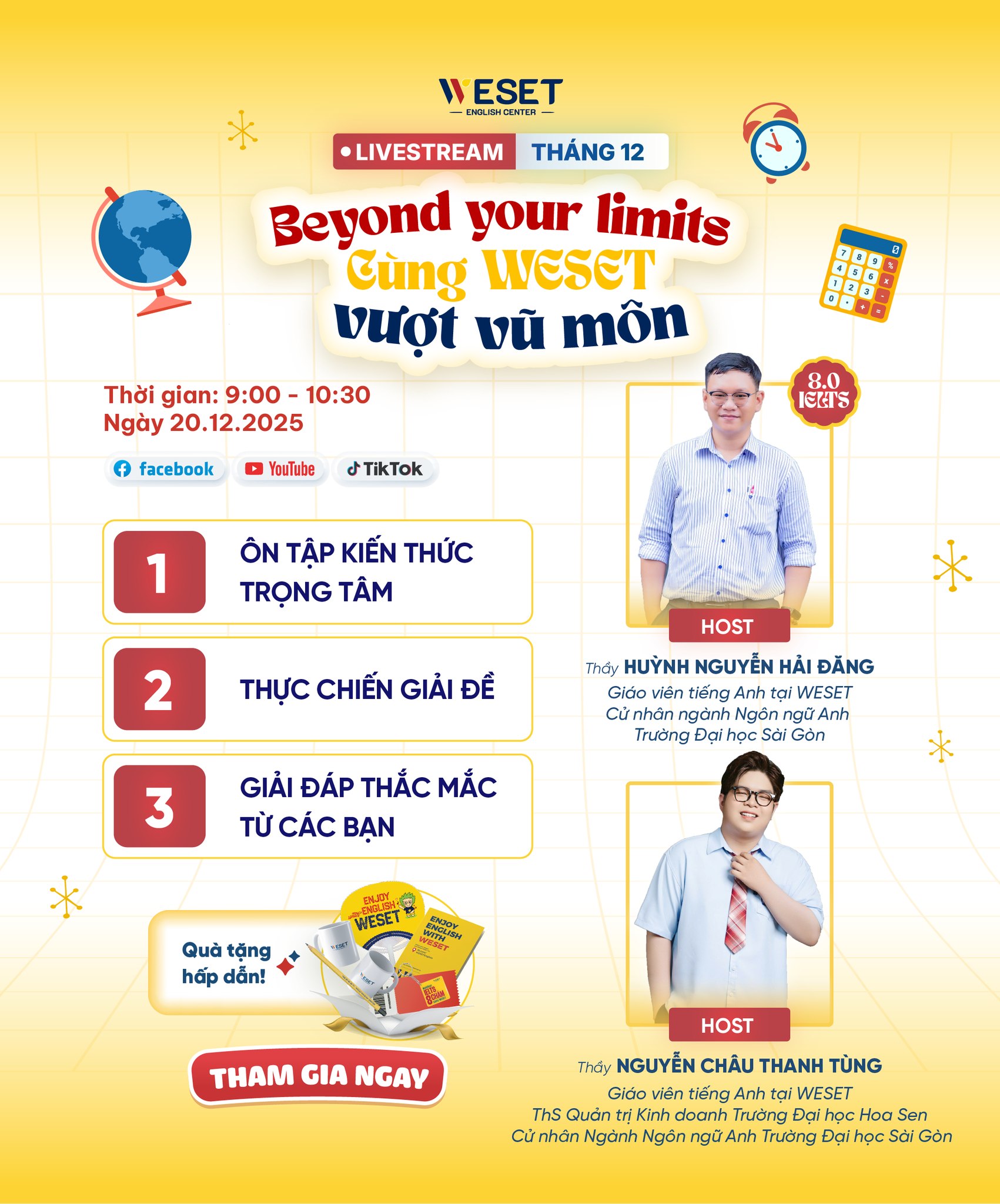 👉 Đừng lo! Phiên livestream “vừa học vừa chơi” sắp tới đây của WESET sẽ giúp bạn gỡ rối, nắm chắc trọng tâm và tự tin bước vào phòng thi môn Anh 💪