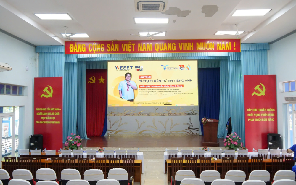 Sáng 19/12, không khí tại Trường Đại học Thủ Dầu Một đã trở nên vô cùng sôi nổi với sự kiện chuyên đề: Từ Tự Ti Đến Tự Tin Tiếng Anh, do WESET phối hợp tổ chức cùng Đoàn trường Đại học Thủ Dầu Một.