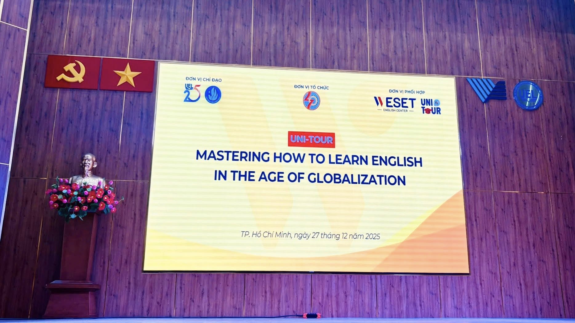 Chiều ngày 27/12/2025, chương trình UNI-TOUR – “Mastering How to Learn English in the Age of Globalization” đã diễn ra tại Trường Đại học Kinh tế – Luật, ĐHQG-HCM, mang đến cho sinh viên một không gian trao đổi cởi mở về cách học tiếng Anh hiệu quả trong bối cảnh hội nhập toàn cầu.