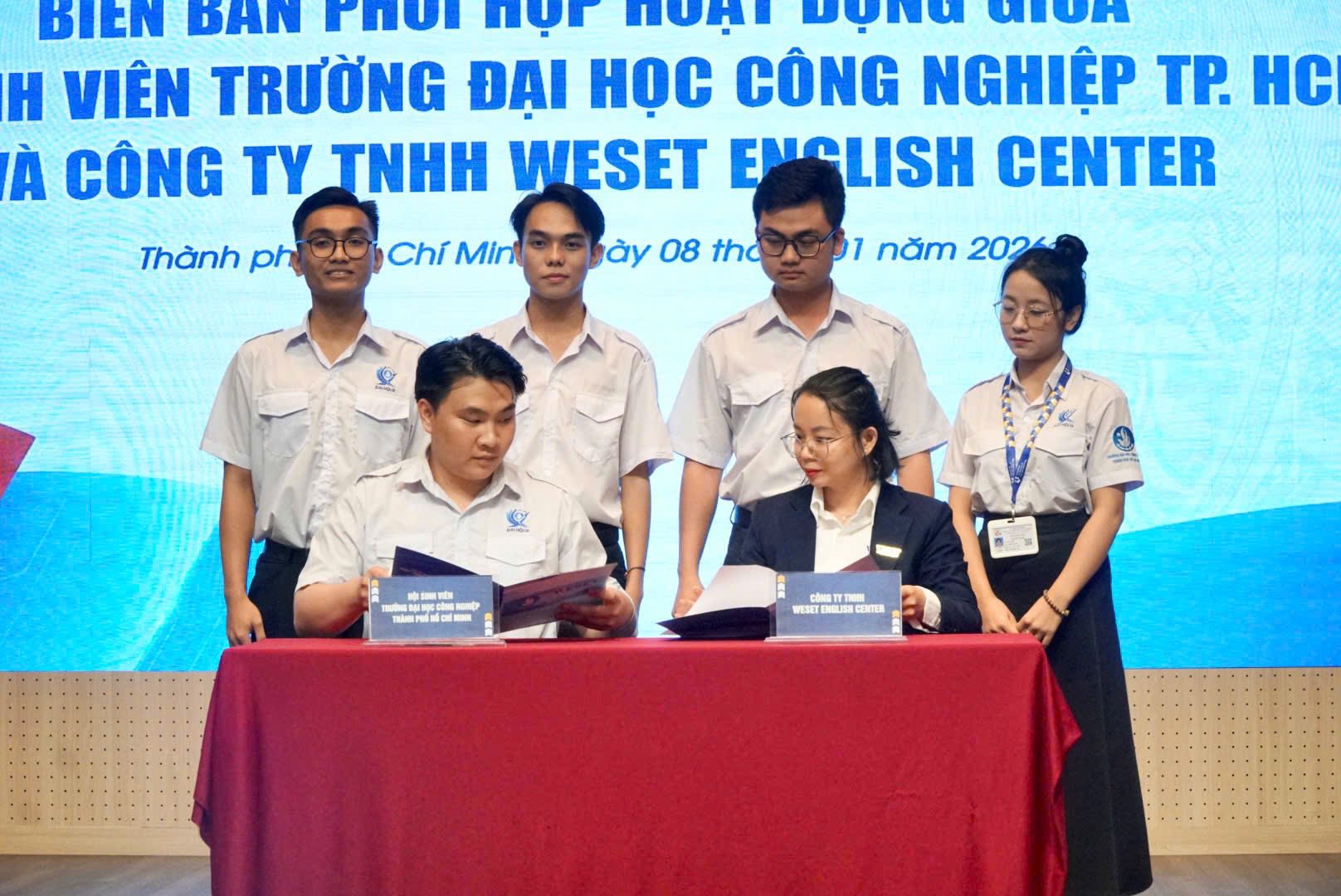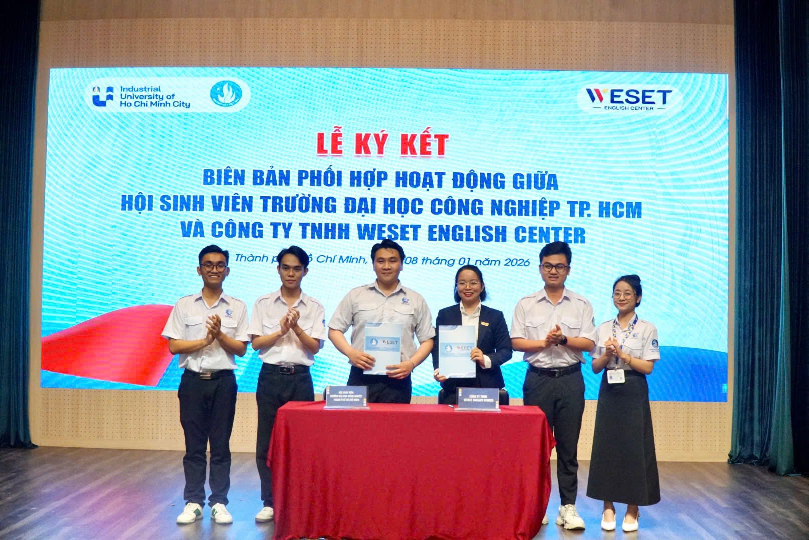 Ngày 08/01/2026, WESET English Center chính thức đánh dấu cột mốc hợp tác cùng Hội Sinh viên Trường Đại học Công nghiệp TP.HCM (IUH) thông qua Lễ ký kết Biên bản phối hợp hoạt động, đồng thời đồng hành tại Lễ tuyên dương danh hiệu Sinh viên 5 tốt.