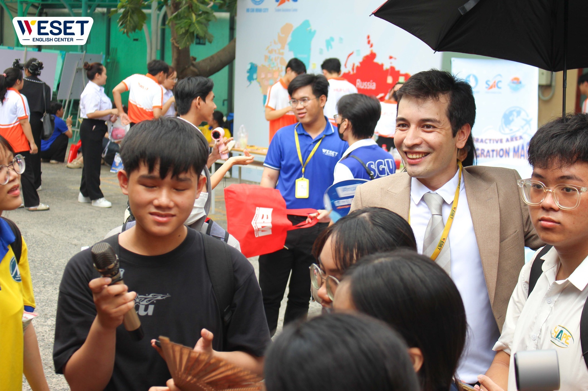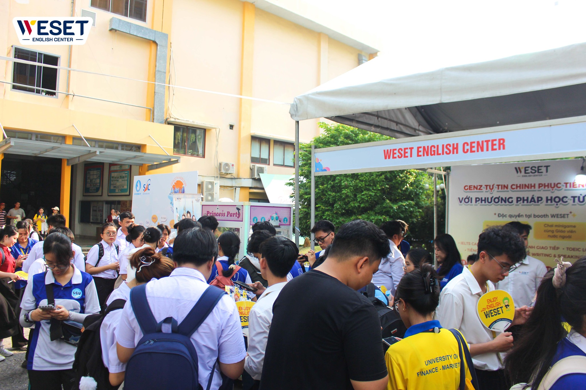 Một điểm thu hút không thể bỏ lỡ chính là gian hàng WESET với sự góp mặt của các giảng viên bản ngữ. Tại đây, các bạn không chỉ được trò chuyện, tham gia minigame mà còn trải nghiệm những buổi học ngắn cùng giáo viên nước ngoài – mô phỏng chính xác môi trường học tiếng Anh tại WESET.