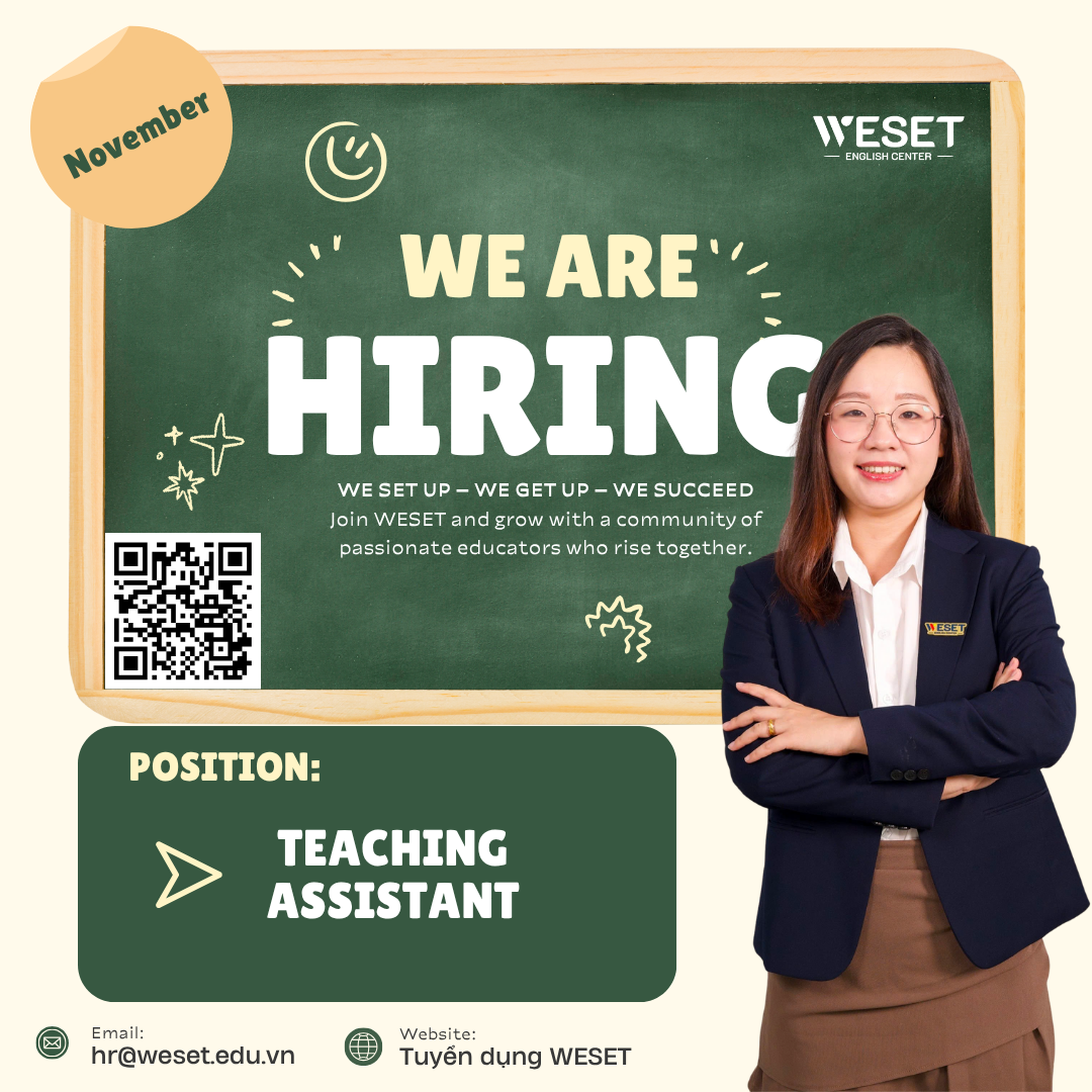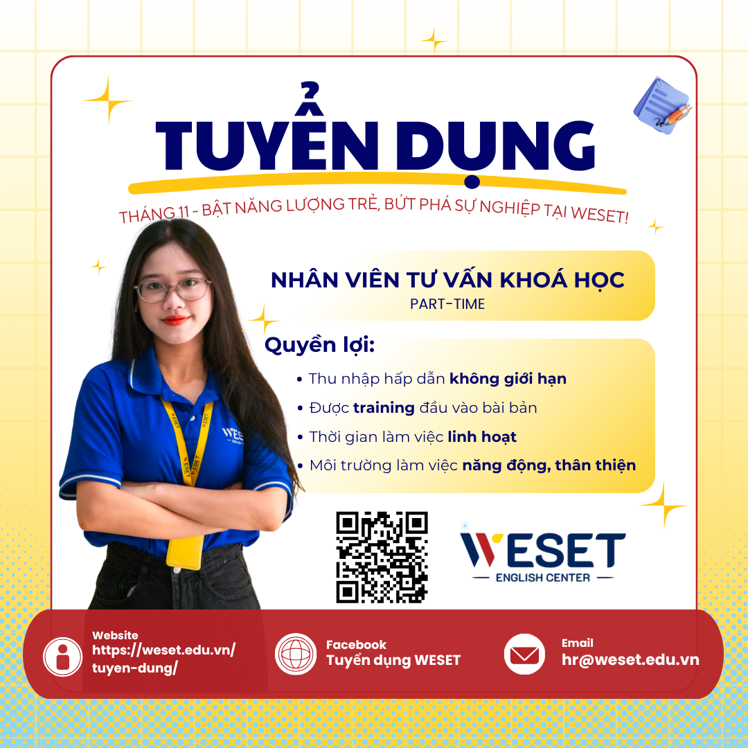 WESET tuyển Giáo viên IELTS lương giờ cao, review lương 1-2 lần/năm, đào tạo chuyên sâu, ưu tiên ca tối 17h-19h. Ứng tuyển ngay!